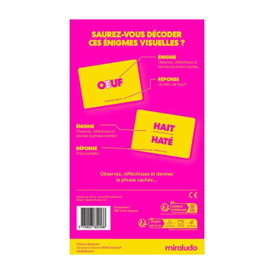 Contenu : 300 cartes énigmes, un cache réponse, un leaflet de règles