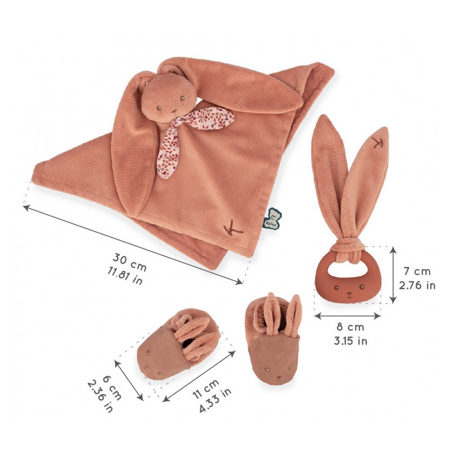 Ce coffret comprend un doudou lapin, un anneau de dentition en silicone et de charmants chaussons lapin, tous dans une magnifique teinte terracotta.