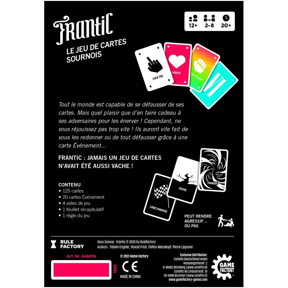 Contenu : 1 règle du jeu, 1 récapitulatif des cartes Evénement, 4 cartes Mémo, 20 cartes Événement, 43 cartes spéciales, 72 cartes couleurs, 9 cartes noires, 1 carte "Fuck You"