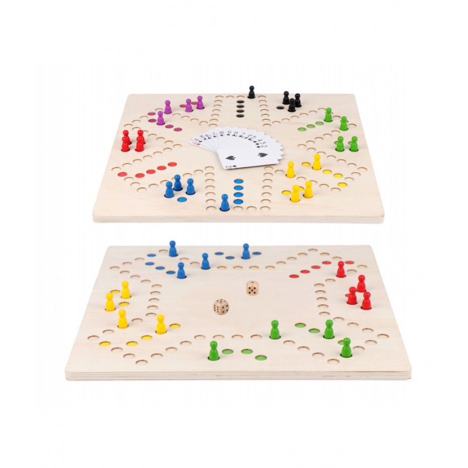 Jeu de tock double face 4 / 6 joueurs. Fabriqué en bois . Le jeu de tock combine le traditionnel jeu de petits chevaux à une part de stratégie, puisque vous devez faire avancer vos pions à l'aide de vos cartes. Certaines cartes vous permettent des mouvements spécifiques afin d'inverser complètement le cours de la partie. Vous pouvez également jouez au petit chevaux grâce aux 2 dés inclus.