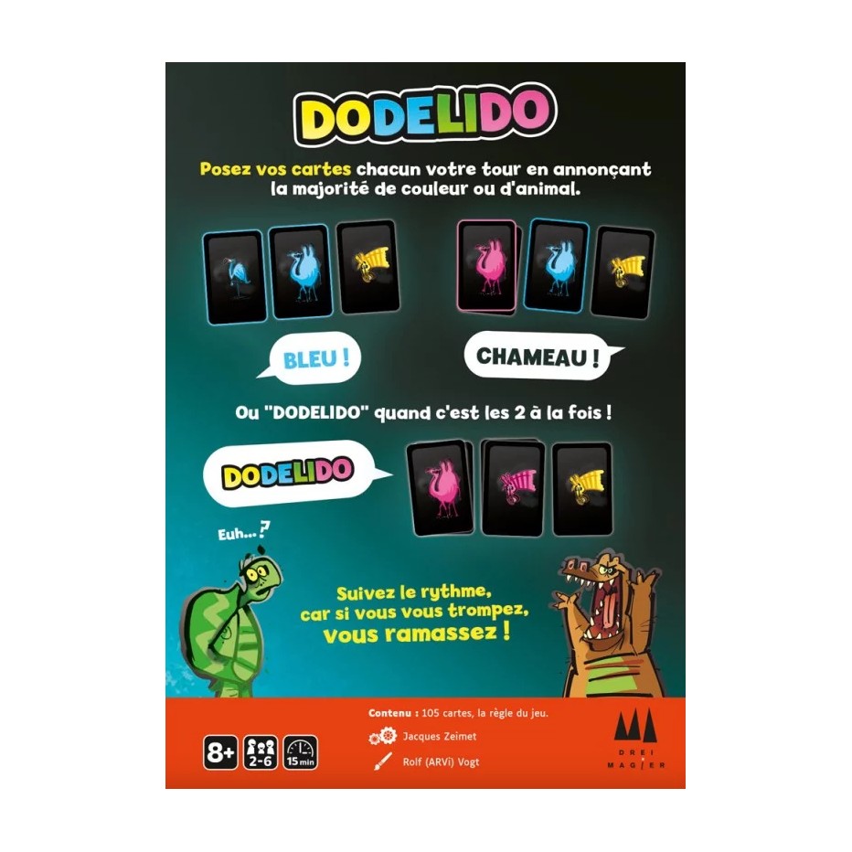 Soyez réactif pour vous débarrassez au plus vite de vos cartes ! A son tour chaque joueur pose sa première carte sur l’une des trois piles et doit donner instantanément la bonne réponse : une majorité d’animaux, de couleurs, ou en cas d’égalité Dodelido ! A moins qu’il n’y ait «rien» à dire ?! Et sans parler du crocodile ou de la tortue qui peuvent s’en mêler !