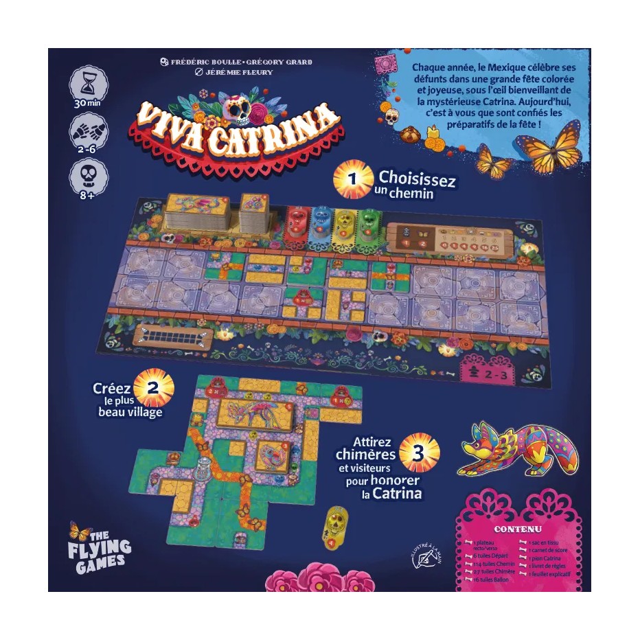 Contenu : 1 plateau recto/verso, 6 tuiles Départ, 114 tuiles Chemin, 16 tuiles Ballons, 27 tuiles Chimère, 1 pion Catrina, 1 sac en tissu, 1 carnet de score, 1 livret de règles, 1 feuillet explicatif