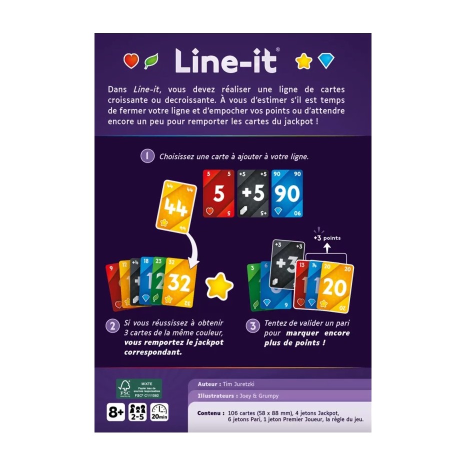 Dans Line-it, vous devez réaliser une ligne croissante ou décroissante. A vous d'estimer s'il est temps de fermer votre ligne et d'empocher vos points ou d'attendre encore un peu pour remporter les cartes du jackpot.