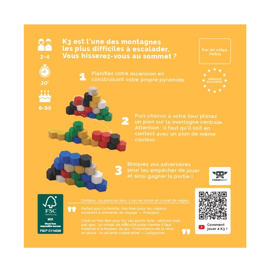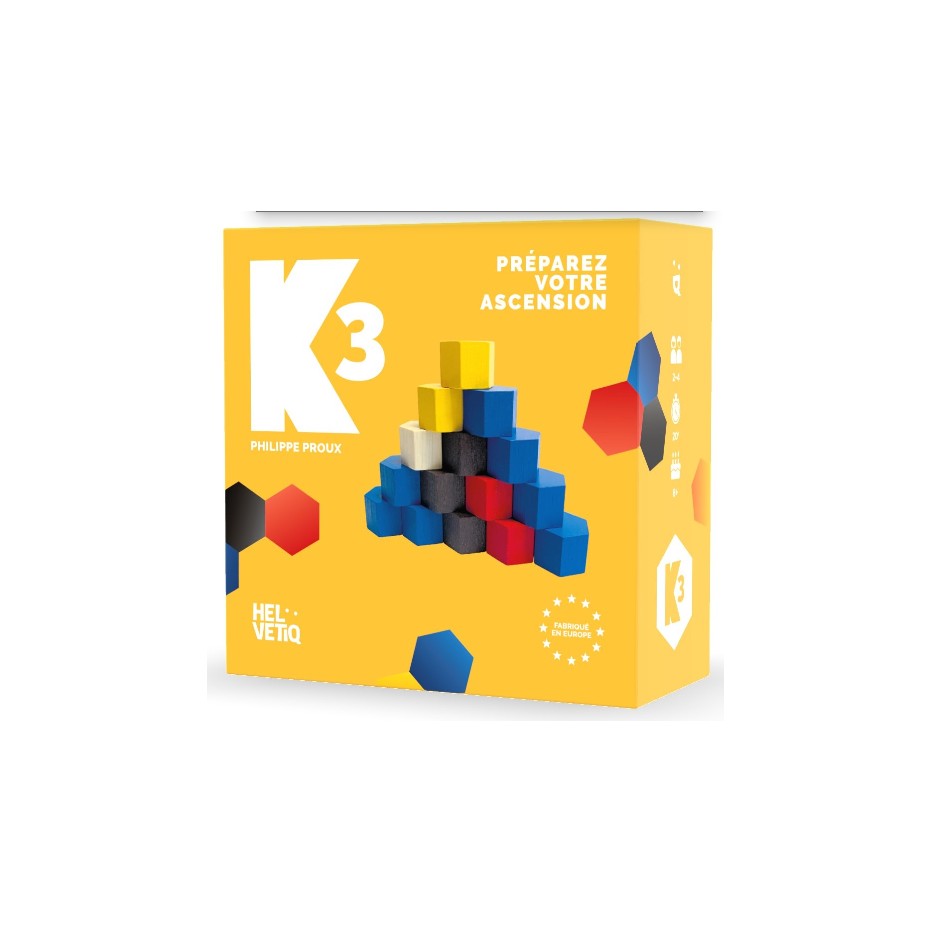 55 pièces en bois multicolores, pour un jeu simple, accessible, et particulièrement tactique ! Du camp de base au sommet du K3, programme ton ascension avec minutie. Place un maximum de pions sur la montagne, mais attention, ne te laisse pas surprendre par le terrain... ou tes adversaires ! Le meilleur grimpeur sera le dernier à se faire éliminer, ou le premier à avoir posé toutes ses pièces ! Contient également un mode de jeu coopératif