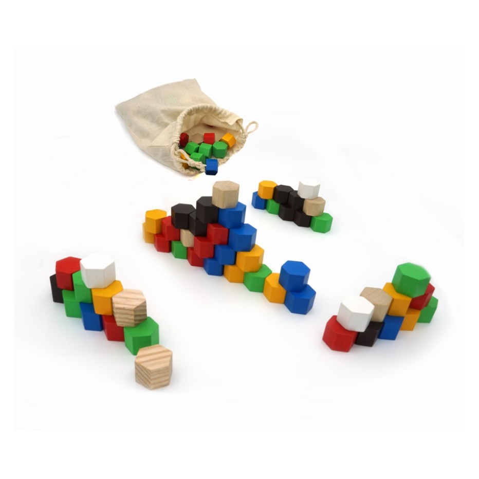 Contenu du jeu : 55 pièces en bois de différentes couleurs, 1 sac en toile, 1 règle du jeu