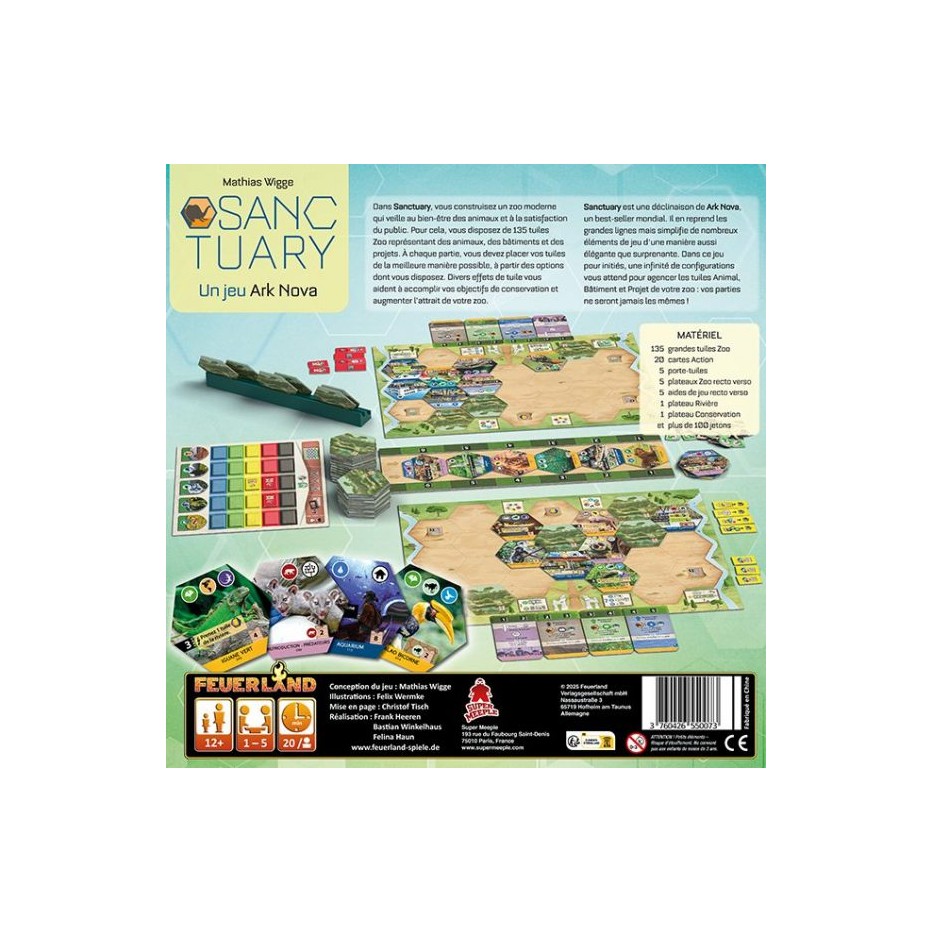 Pour cela, vous disposez de 135 tuiles Zoo représentant des animaux, des bâtiments et des projets. À chaque partie, vous devez placer vos tuiles de la meilleure manière possible, à partir des options dont vous disposez. Divers effets de tuile vous aident à accomplir vos objectifs de conservation et augmenter l’attrait de votre zoo. Sanctuary est une déclinaison de Arc Nova, un best-seller mondial. Il en reprend les grandes lignes mais simplifie de nombreux éléments de jeu d’une manière aussi élégante que surprenante.