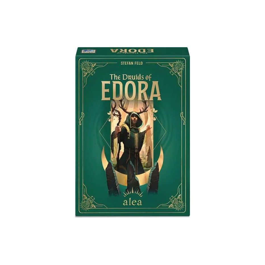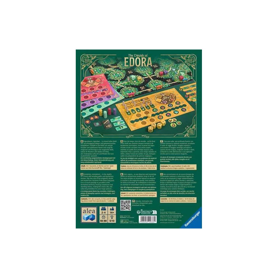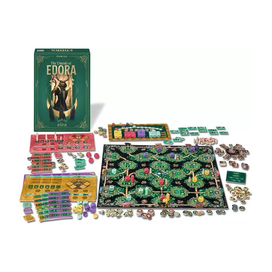 Contenu : 1 plateau de jeu (17 pièces), 1 plan d'évolution, 4 plateaux de joueurs, 24 stèles, 24 menhirs, 15 dolmens, 24 gemmes, 30 tablettes Objectifs, 20 gui, 40 sacs de nourriture, 18 potions magiques, 16 jetons Feu, 6 pierres de l'Oracle, 1 Oracle, 52 dés, 4 pions, 48 herbes médicinales, 4 marqueurs de savoir, 4 serpes, 4 marqueurs de points de prestige, 8 jetons de points de prestige, 1 règle du jeu