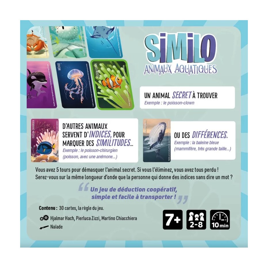 Similo Animaux Aquatiques est un jeu de déduction coopératif dans lequel les joueurs doivent retrouver l'animal secret du Narrateur à l'aide d'autres animaux. Similitudes, différences, à vous de deviner ce que le Narrateur essaye de vous indiquer. Est-ce un poisson ou mammifère ? Un carnivore ? Un animal de grande taille ? Autant de questions que vous devrez vous poser pour remporter tous ensemble la victoire!