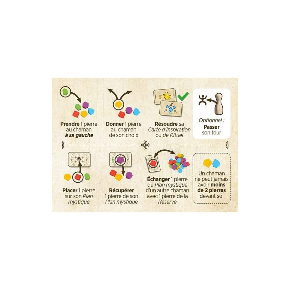 Chacun votre tour vous jouez 1 action et une seule parmis les 7 possibles du jeu. Le tout en silence et sans donner d’indication gestuelle sur vos intentions. Les autres chamans devront interpréter votre but uniquement grâce à vos actions.