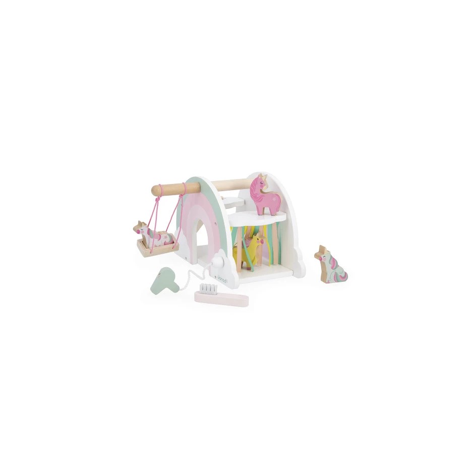 Livrée avec 4 figurines licornes et 2 accessoires en bois, cette maison magique favorise le développement de l’imagination des petits.
