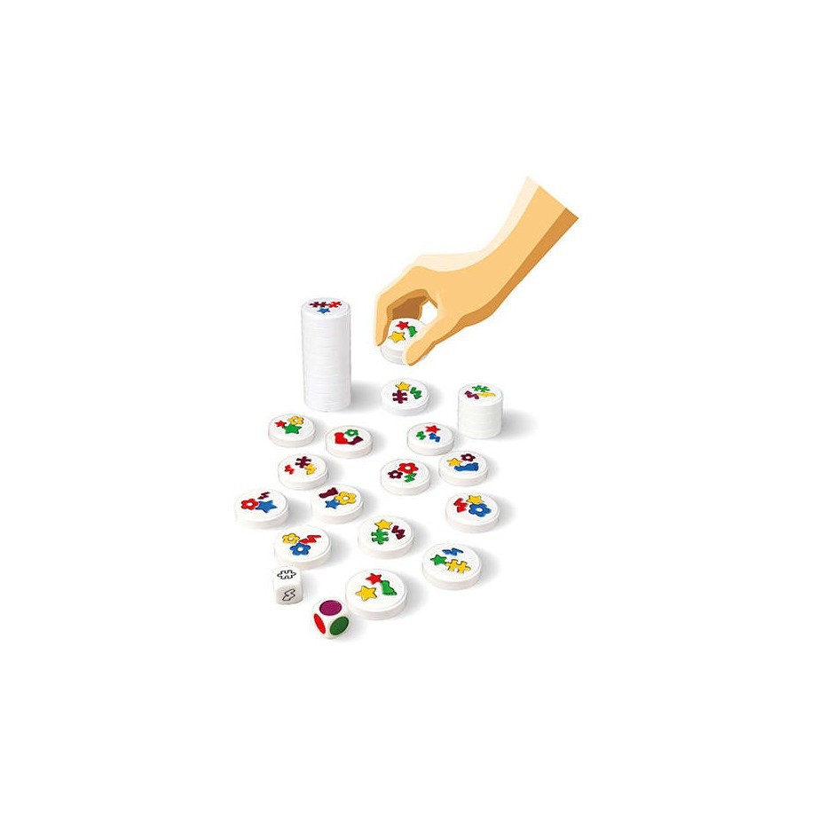 CONTENU : 32 disques magnétiques, 1 dé Symbole, 1 dé Couleur, règle du jeu
