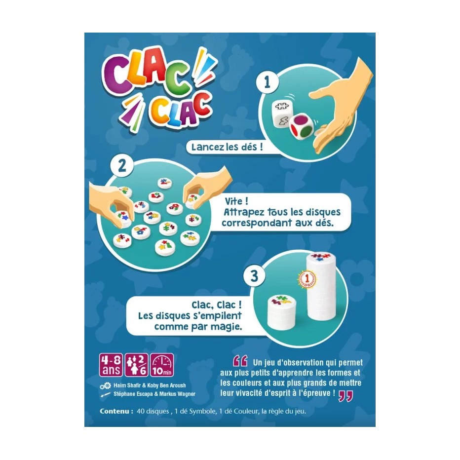Les disques sont aimantés : «Clac! Clac ! » ils s’empilent comme par magie, mais on ne peut utiliser qu’une seule main ! Il faut aller très vite pour les empiler sans se tromper, sinon gare aux pénalités… Puis on entame un nouveau tour. Quand tous les disques ont été ramassés, la plus haute pile indique le vainqueur.