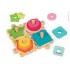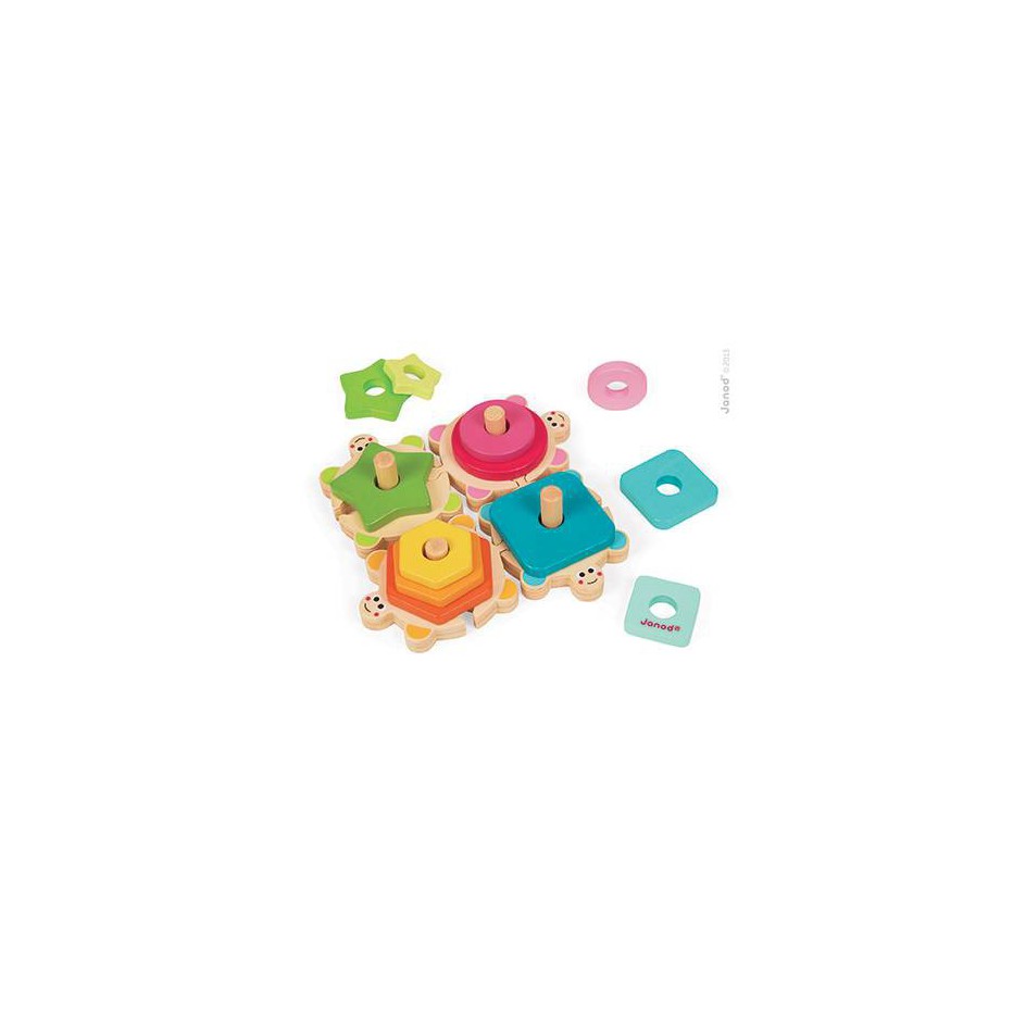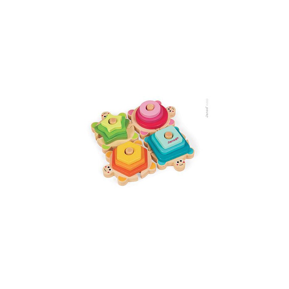 Puzzle composé de 4 tortues à relier entre elle. Sur chaque tortue, on peut empiler jusqu'à 3 formes géométriques de la couleur correspondante à la tortue.